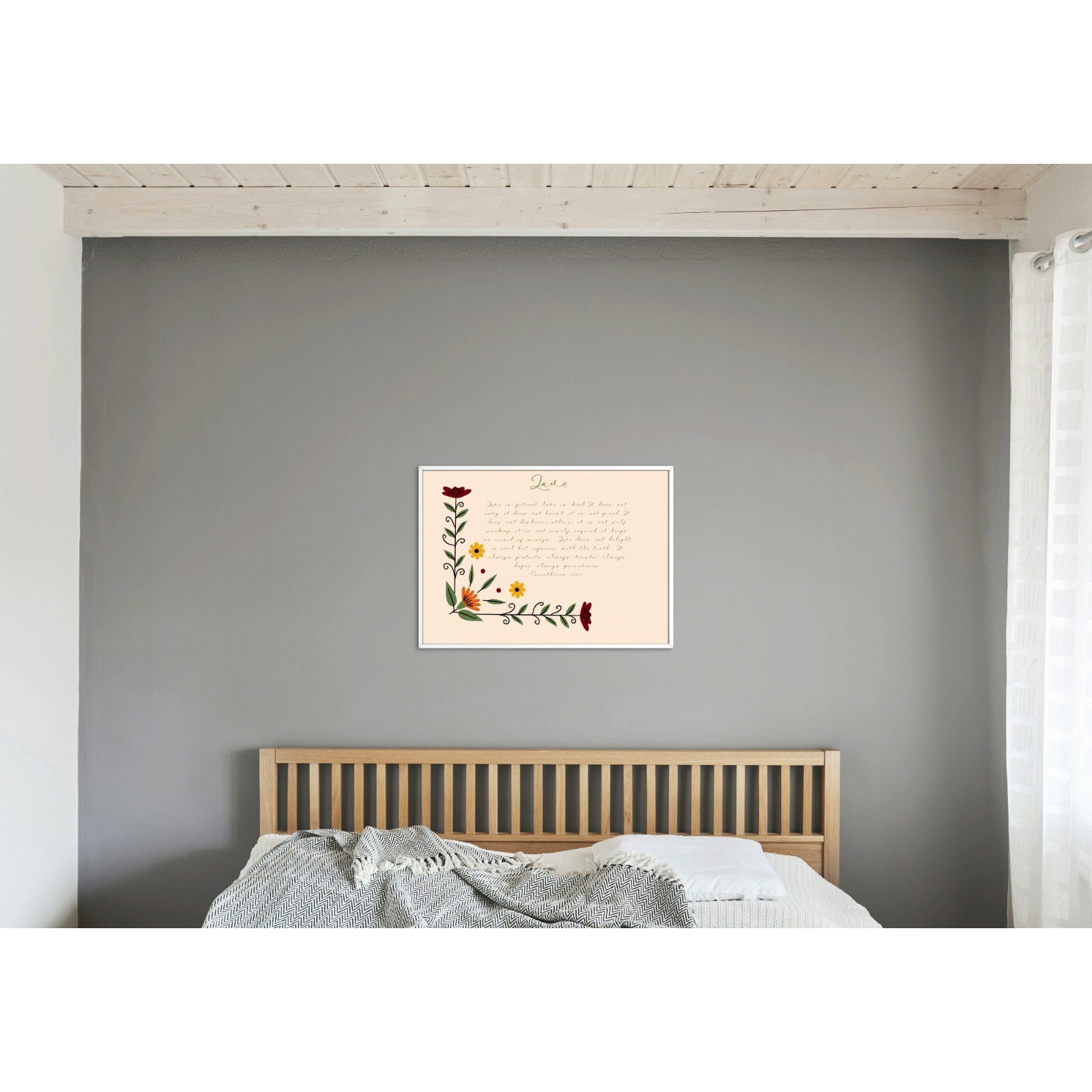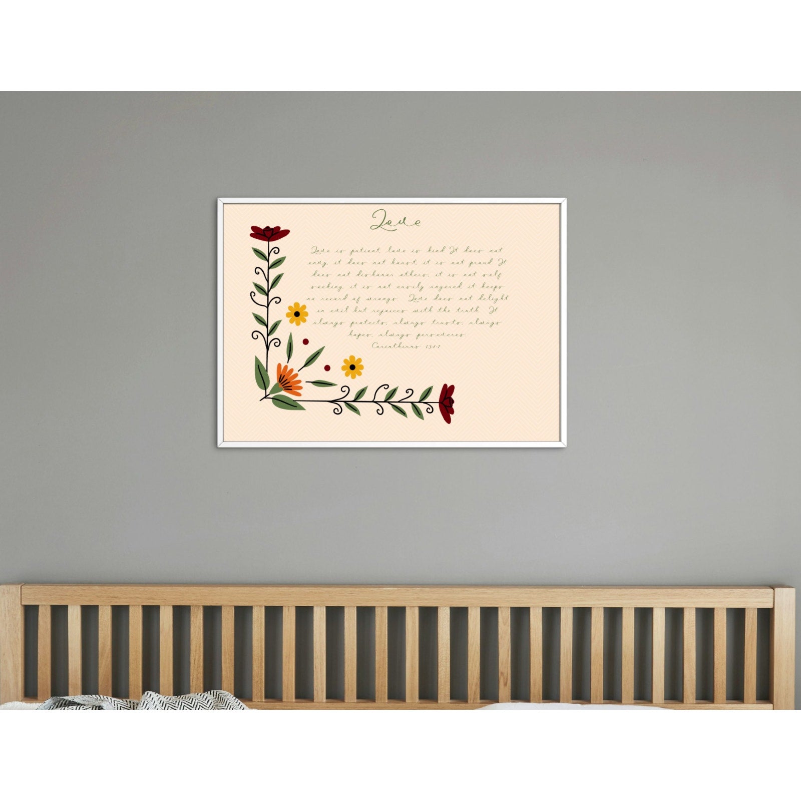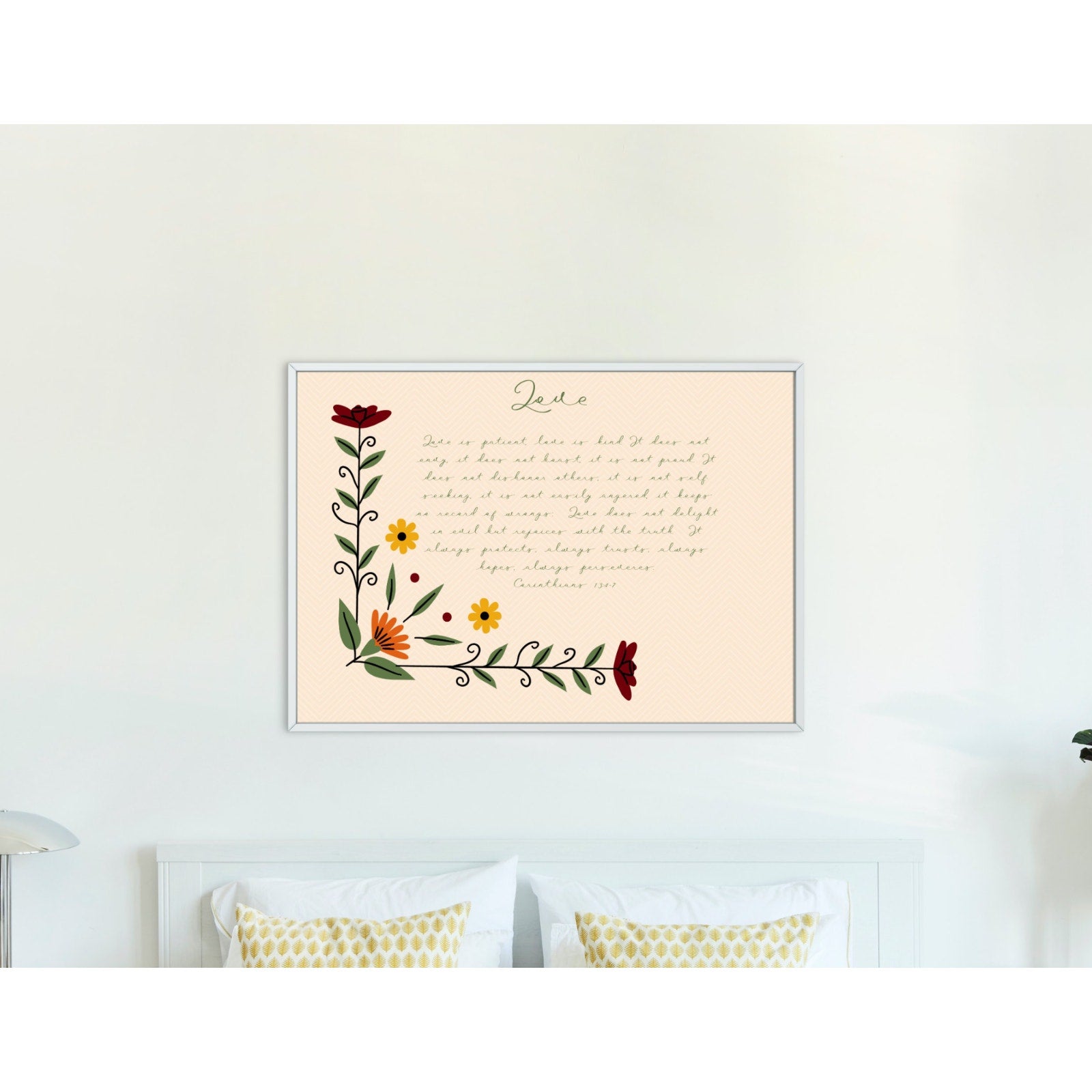 This design features a cream colored background and red, orange and yellow flowers in the lower left hand corner. Includes Bible verse 1 Corinthians 13:4-7 in the center, which reads "Love is patient, love is kind. It does not envy, it does not boast, it is not proud. It does not dishonor others, it is not self-seeking, it is not easily angered, it keeps no record of wrongs. Love does not delight in evil but rejoices with the truth. It always protects, always trusts, always hopes, always perseveres." in an elegant, cursive, green font.