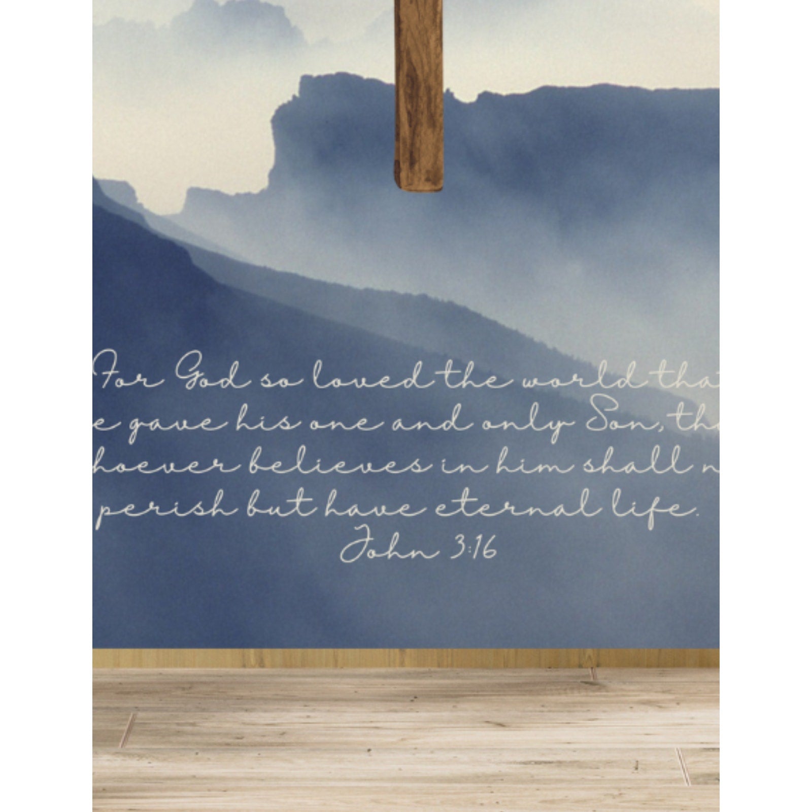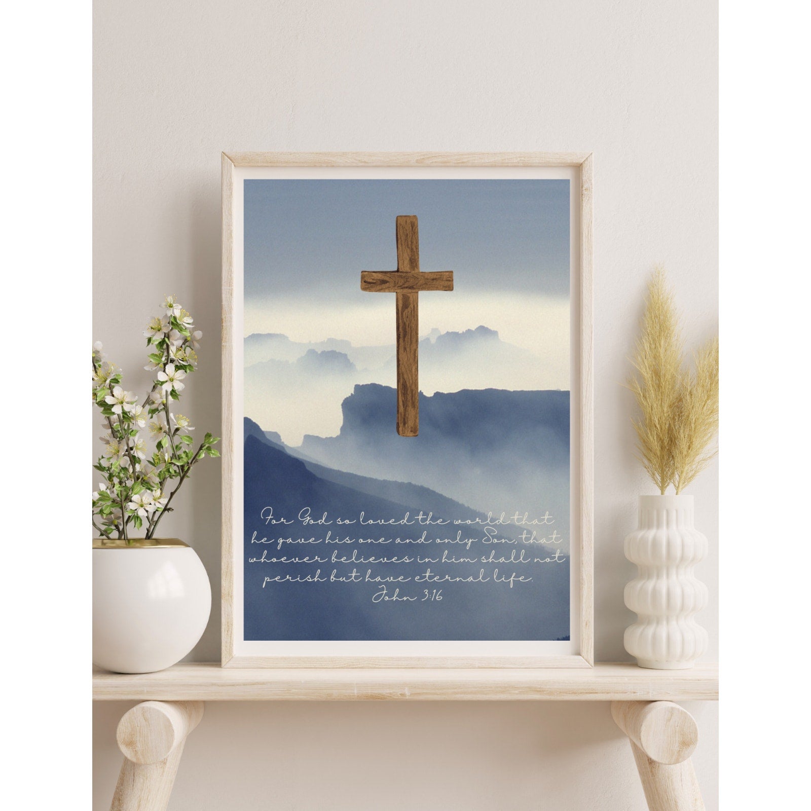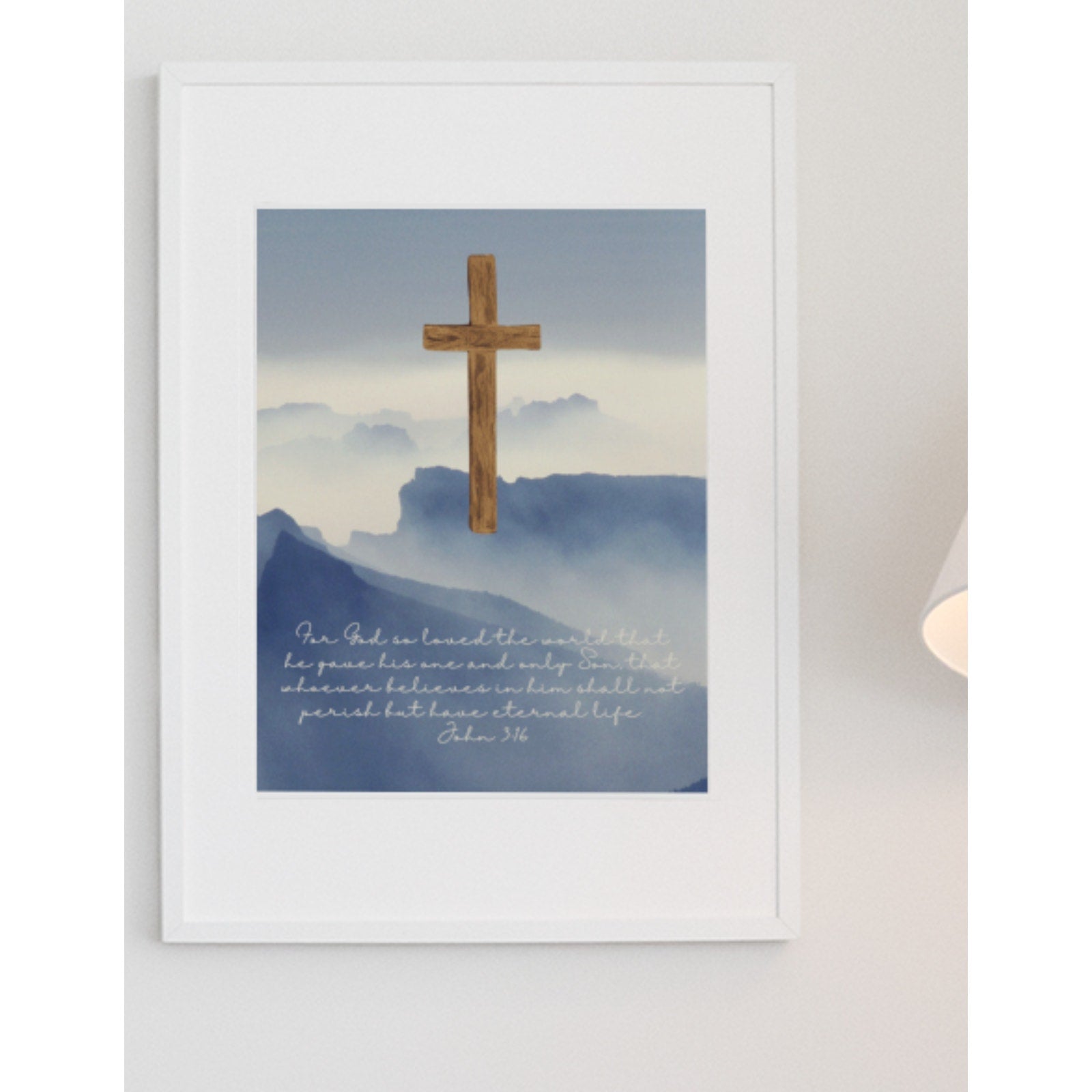 This faith based art print is a great way to display your faith and love of Jesus Christ. This stunning art print features a beautiful grey sky with mountains and a prominent cross in the center, accompanied by a powerful scripture quote from the Bible that reads- "For God so loved the world that he gave his one and only Son, that whoever believes in him shall not perish but have eternal life. John 3:16.", in white elegant font. This stunning print is perfect for any room and adds a touch of faith-based inspiration to your home décor. This print is a must-have for any religious-themed collection.